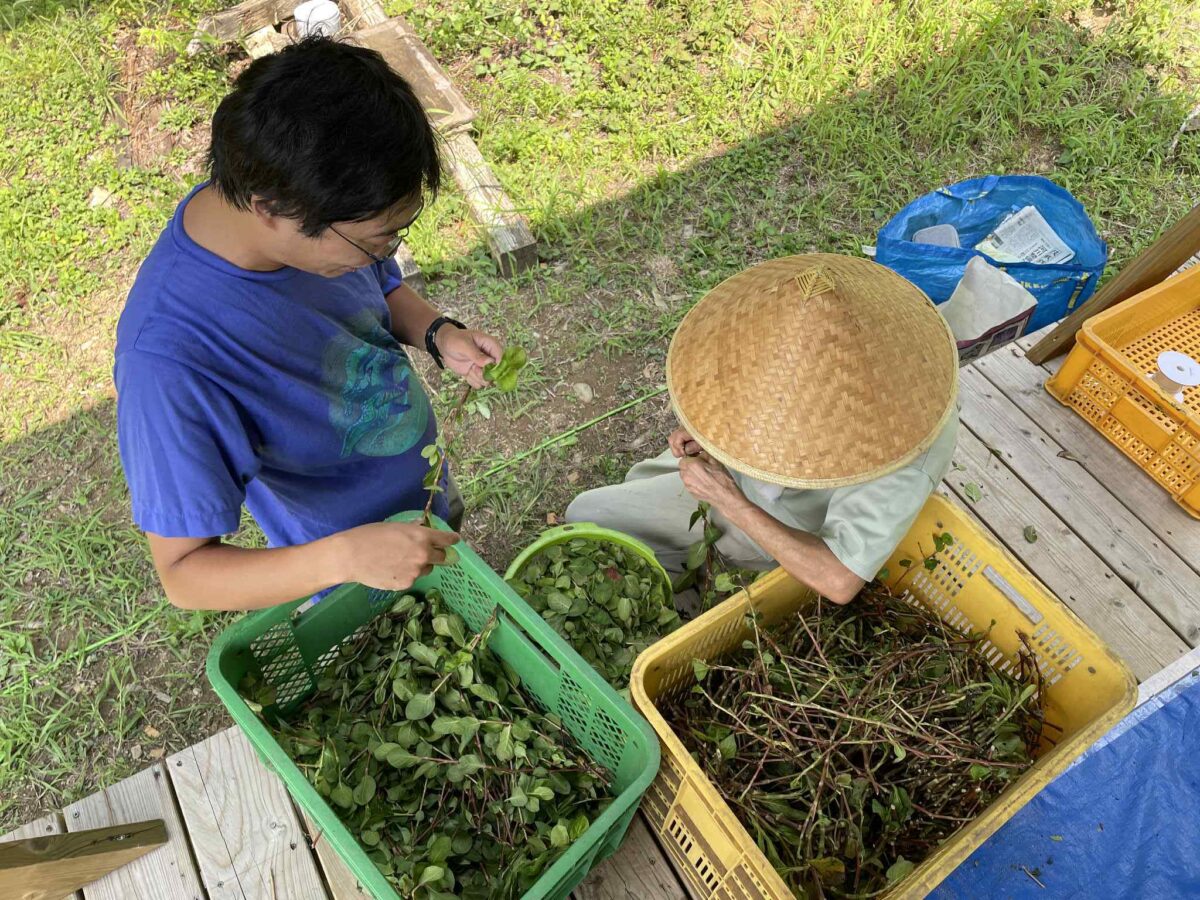 筆者が訪れたのはあべさんの滞在の最終日だった。藍染めをした農業チームの一人が蕎麦を茹でてくれて、藍の布の下、参加者とあべさんの昼食会に入れていただいた。農園で育てたというジャガイモとナスの味噌汁も美味しかった。昼食後、忙しい合間を縫って渡邉さんがテラスにやってきて、三線を弾いてくれるというサプライズも。波のように揺れる布の下、みんなで「涙そうそう」を歌った。