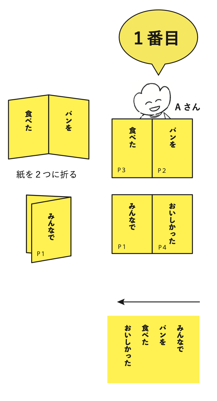 「まず1番目の人が、紙を2つに折り、表と裏4ページ分にお話を書きます。例えば『みんなで/パンを/食べた/ おいしかった』。単純なことでいいんです。それを相手に渡します」。