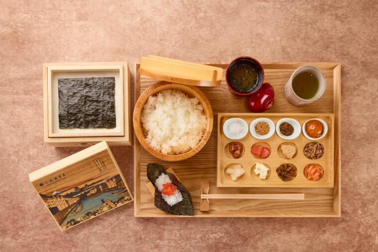 老舗の山本海苔店が新しい海苔の楽しみ方を提案する初の飲食業態。おひつに入ったご飯と多種のおかず、注文を受けてから温める海苔を手巻きスタイルで楽しめる。