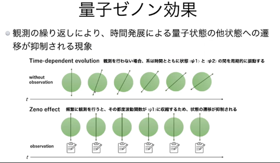 量子状態は本来、時間とともに別の状態へと「揺れ動いて」いきますが、途中で観測をすると、その瞬間にどれか一つの状態へと「収縮(決め打ち)」されます。さらに、同じ種類の観測をとても頻繁にくり返すと、そのたびに同じ状態へ収縮し直されるため、結果としてほとんど変化しなくなってしまう。これが量子ゼノン効果と呼ばれる現象です。ちなみに「ゼノン」とは、「飛んでいる矢は移動しているように見えるが、各瞬間を切り取ると止まっている。したがって矢は止まっている」という、有名な「ゼノンのパラドクス」から来ています。