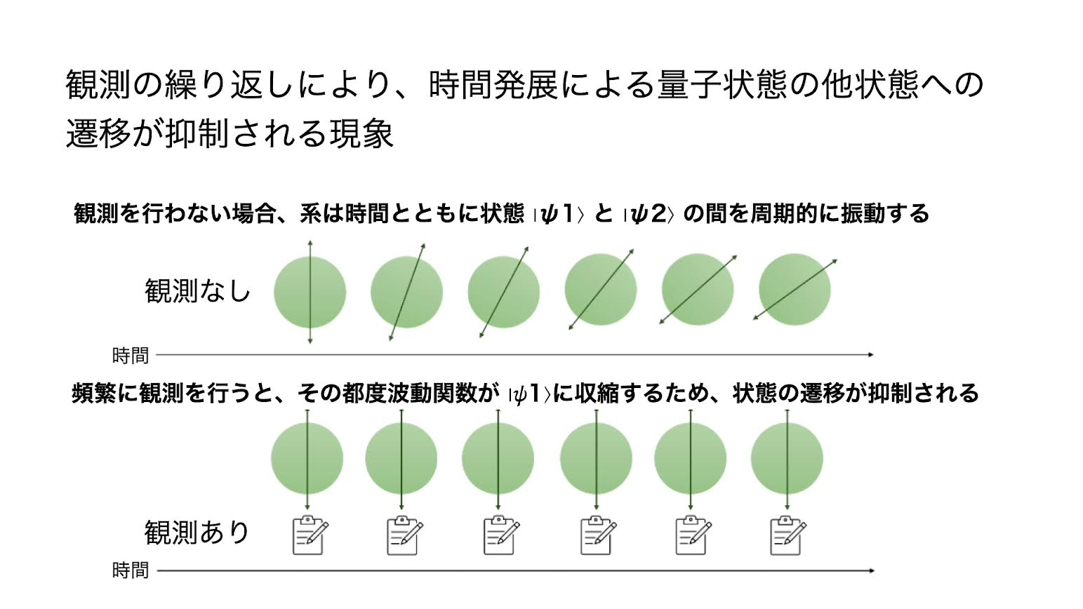 量子状態は本来、時間とともに別の状態へと「揺れ動いて」いきますが、途中で観測をすると、その瞬間にどれか一つの状態へと「収縮(決め打ち)」されます。さらに、同じ種類の観測をとても頻繁にくり返すと、そのたびに同じ状態へ収縮し直されるため、結果としてほとんど変化しなくなってしまう。これが量子ゼノン効果と呼ばれる現象です。ちなみに「ゼノン」とは、「飛んでいる矢は移動しているように見えるが、各瞬間を切り取ると止まっている。したがって矢は止まっている」という、有名な「ゼノンのパラドクス」から来ています。